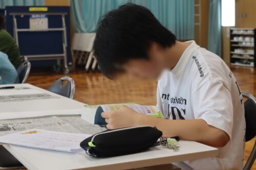 真剣な表情で辞書を使い、漢字や季語を調べています。