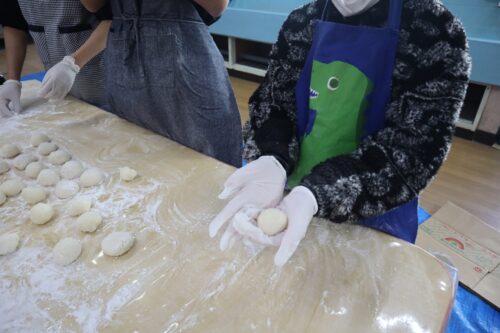 あつあつのもち米の香りに、子どもたちからも「年末が来たなって感じがする。」「今年ももうおしまいだね。」と1年を振り返って懐かしむような声もありました。 もちをついた後は、自分たちで食べやすい大きさに丸めていきます。意外と難しく、職員の手本を見ながら一生懸命丸めました。