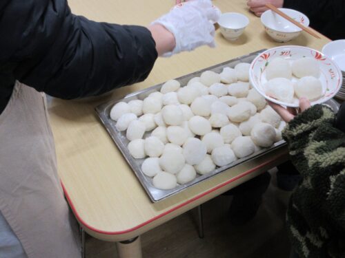 そうこうしているうちに昼食の時間。 昼食はみんなで一生懸命ついたもちと、あたたかい豚汁です。 たくさん動いて、たくさん食べて大満足!来年も良い一年になりますように。