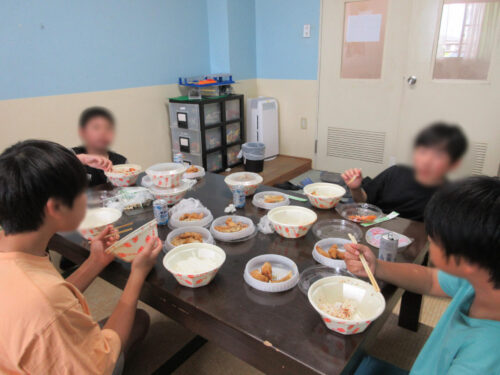 夏休み最後の思い出として夏らしいことをと考え、かき氷づくりと花火大会を行いました! 昼食には餃子の王将の寄付で頂いたご飯を食べました。キムチやふりかけをご飯にかけて食べました。